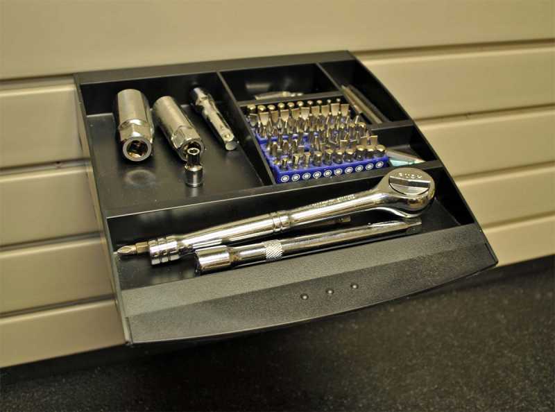 Custom work areas, tool cabinets, specialized shelving, and more combine to create a space that provides solutions and allows for neat organization.